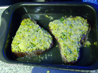 Se mezclan con el huevo, el pan rallado y un poco de cáscara de limón rallado. Se condimenta con sal y pimienta recién molida y se procede a embetunar toda la parte de arriba del atún.