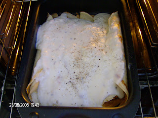 Hacemos la bechamel, derritiendo al fuego la mantequilla, agregamos las dos cucharadas de harina que habremos disuelto en una taza de leche fría, ayudados por un batidor de alambre. Le agregamos la mezcla a la mantequilla, fuera del calor, luego revolvemos y volvemos al fuego e incorporamos el resto de la leche. Dejamos hacer hasta espesar, entonces condimentamos con sal y pimienta negra.