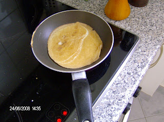 Partimos con los panqueques, que como sabrán se hace mezclando todos los ingredientes y logrando un batido semi-claro. Vaciamos por cucharadas en una sartén de teflón grande y hacemos los panqueques. Dejamos un poco de batido reservado para el postre.