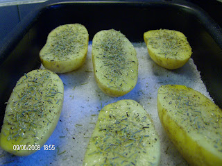 Se lavan las papas, se secan y se cortan por la mitad, a lo largo (crudas y con piel).